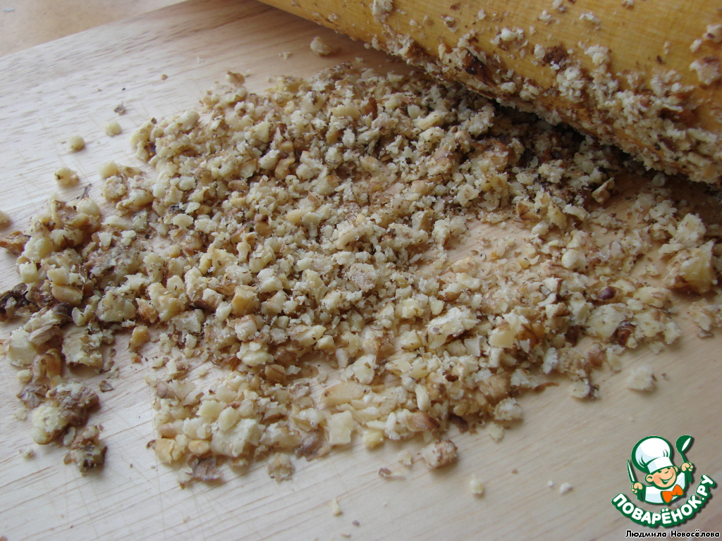• Грецкие орехи прожарить на сковороде 3-4 мин и прокатать скалкой.