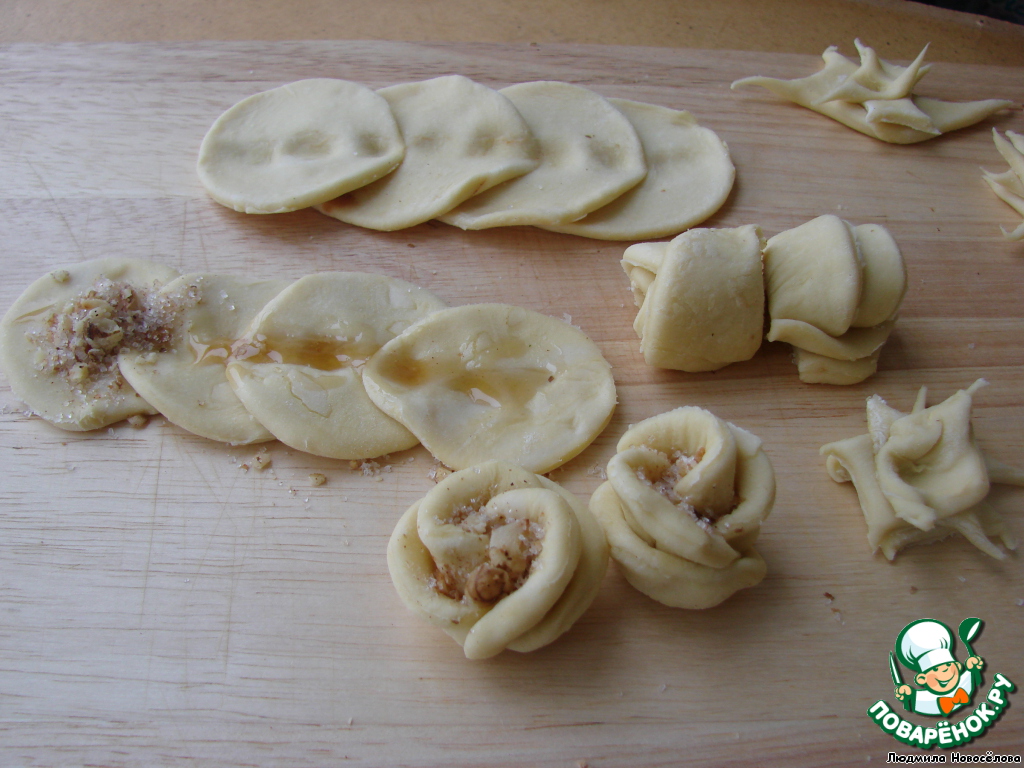 Обрезки наложила друг на друга, где то по 4-5 штучек, пальчиком в серединочку нажала, они приплюснулись, капнула мёд и в духовку, получились типа звёздочки. Вообщем процесс безотходный. (Батарейка села, фото не очень получилось.)