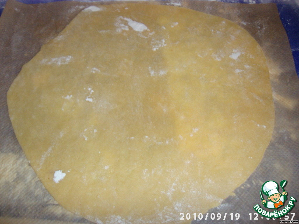 Раскатаем тонкие коржи, наколим их вилкой в нескольких местах (чтобы не вздувались) и выпекаем, пока не зарумянятся в разогретой до 180 С духовке.