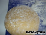 Когда всё растворится, снимем с огня, вобьем яйцо. Отдельно просеем муку с содой и солью. Постепенно добавляя муку, замесить некрутое тесто. Оставить его, накрыв полотенцем, на 15 мин.