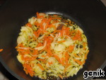 Морковь чистим и натираем на крупной терке. Лук режем полукольцами. Обжаривем на оливковом масле.