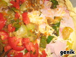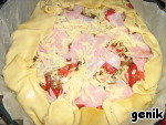 В форму из огнеупорного стекла выкладывем слой слоеного теста (на бумаге), вилкой делаем дырочки в тесте. Выкладываем половину начинки, слой ветчины, порезанной тонкими пластинками, слой тертого сыра. Повторяем слои.