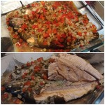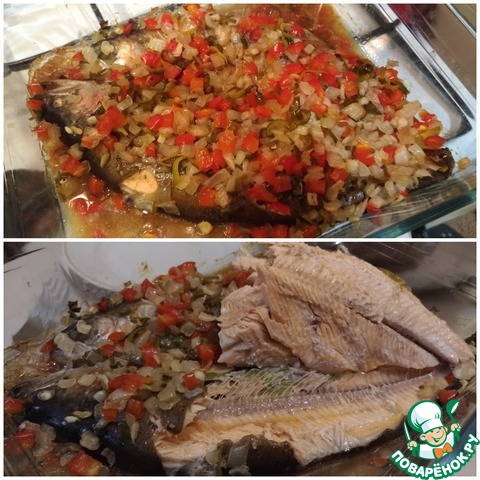 Выложить мексиканскую рубашку из перцев и лука на форель, полить соусом.