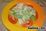 Добавляем зеленый салат, все перемешиваем, заправляем майонезом, выкладываем нарезанные помидоры. Приятного аппетита!