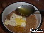 К овсяной крошке добавим тёплое сливочное масло и мёд.