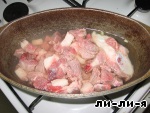 В кастрюлю с толстым дном положить лук, чеснок, а сверху мясо и косточки.
