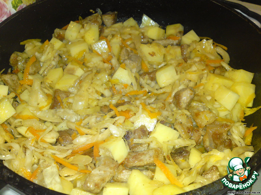 Картофель режем кубиками и добавляем к мясу, пока он обжаривается, добавляем капусту (сок отжимать не нужно!)