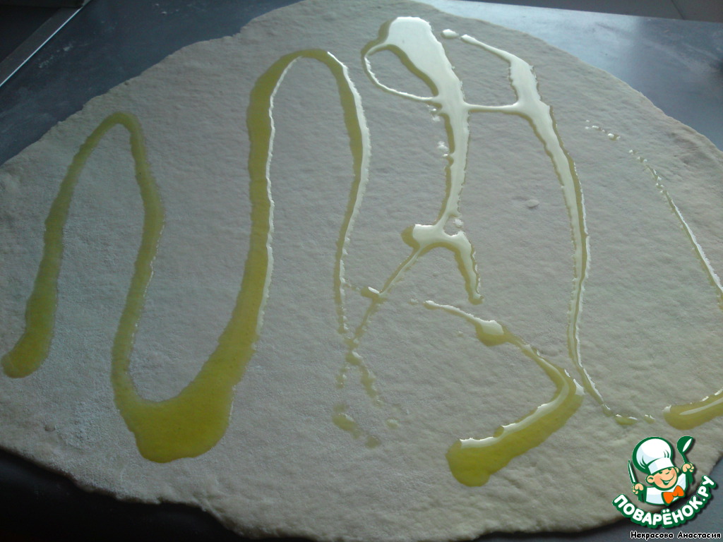 В это время замешиваем тесто. Оно не должно быть слишком тугим, но и не должно липнуть к рукам, если потребуется еще муки, то добавьте, но не переборщите! Раскатываем тесто в пласт, смазываем оливковым маслом!