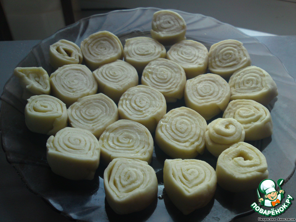 Заворачиваем тесто в плотный рулет и режем на маленькие рулетики толщиной в 1 см.