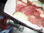 1. Мясо - свинину и говядину вместе с репчатым луком и чесноком пропустить через мясорубку с мелкой решeткой.