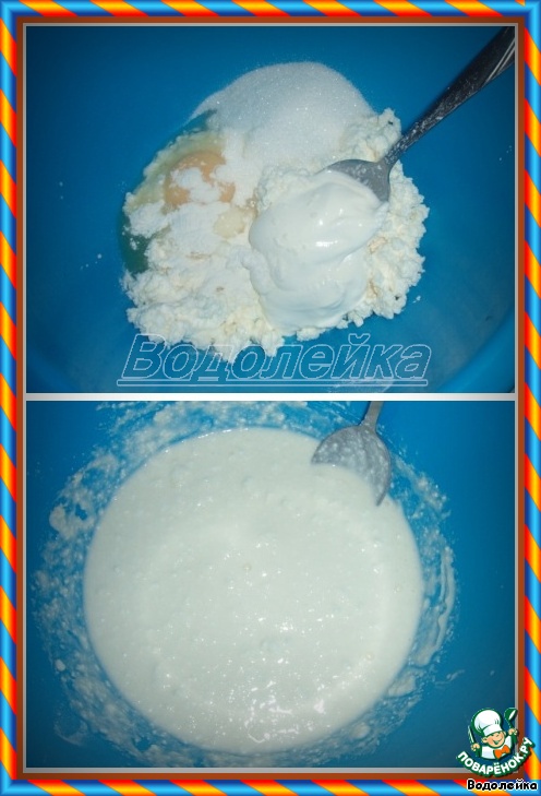 Итак, готовим начинку. Смешиваем до однородной массы (я делала это при помощи комбайна) творог, сметану, желток, сахар, ванильный сахар, мак (я не использовала, для любителей количество по желанию), манку.