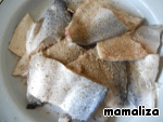 Рыбу почистить, срезать голову, хвост и плавники. Острым ножом надрезать рыбу вдоль хребта с двух сторон и отделить филе. Каждое филе разрезать на 3 части. Порционные куски посолить и приправить специями.