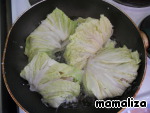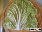Отрезать 12 капустных листов (верхнюю часть). На каждом листе срезать утолщение и слегка отбить деревянным пестиком.
