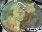 Обжаренные конвертики сложить в ту же сковороду, подлить немного воды и потушить под крышкой минут 10.