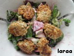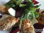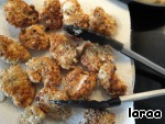 Куриную грудку нарезать на порционные кусочки. Обвалять в муке. Затем в яйце и в последнюю очередь - в орехах.