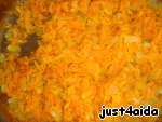 Трем морковку на крупную терку и режем лук кубиками и обжариваем все это на растительном или оливковом масле. Солим, перчим и выдавливаем зубчик чеснока. -