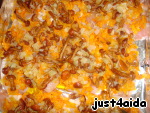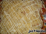 Трем сыр на терке крупной, посыпаем и поливаем сверху майонезом. Я ставила в духовку сначала на максимум, а кода сыр начал золотиться, то поставила на небольшой ход потомить.