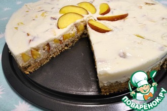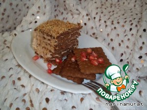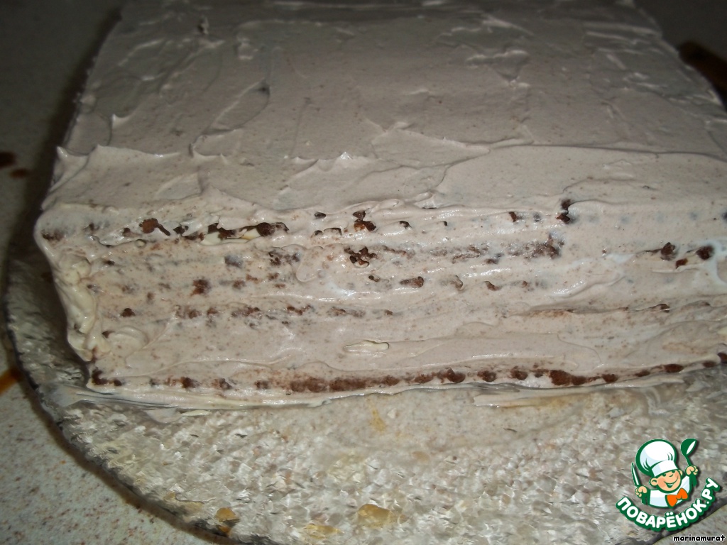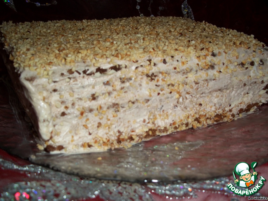 Бока хорошо промазываем оставшимся кремом и украшаем орешками или шоколадом (у меня было кофейное печенье, хотя нужно обычное белое, поэтому шоколад был бы лишним в моем случае, а орешки прекрасно подошли). Ну вот, тортик готов, ставим его для пропитки в холодильник на 4 часа, а лучше - на ночь, как сделала я. Тортик готов, достаем из холодильника, нарезаем порционно и наслаждаемся буйством вкусов в одном маленьком чудесном лакомом кусочке!