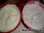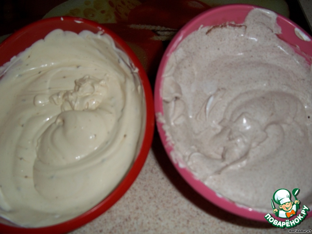 Делаем крем. Миксером взбиваем крем-чиз и сливки с 4 ст. л. сахара (или сахар можно потом в готовый крем по 2 ст. л. в каждую тарелку). Делим крем на 2 части: в первую кладем 1 ст. л. кофе, во вторую 1 ст. л. какао, перемешиваем. Крем готов.