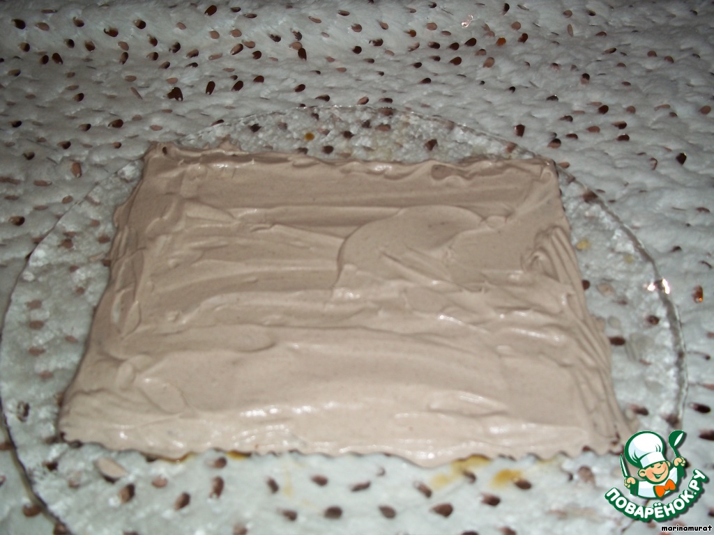 Собираем торт следующим образом: обмакиваем печенье в кофейный сироп и выкладываем первый слой, на него - крем с какао (каждый слой - 9 печенек, можете сделать 12, если много гостей, тогда увеличить количество крема).