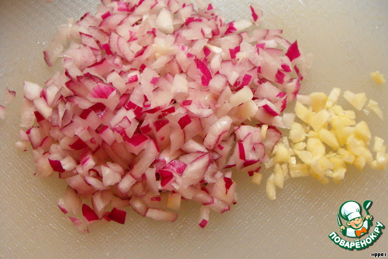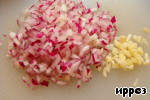 Лук и чеснок почистить и мелко порубить, смешать. -