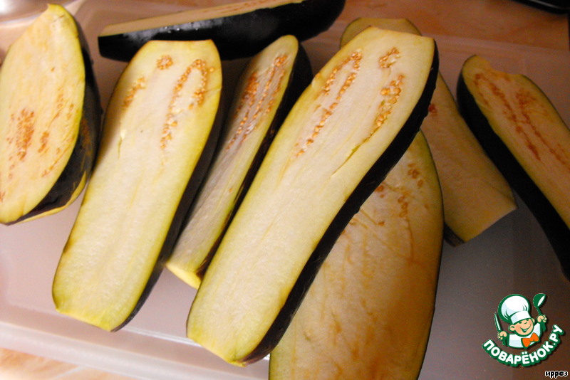 Баклажаны помыть, удалить плодоножку и разрезать пополам.