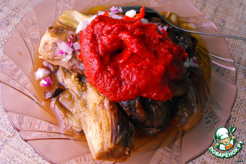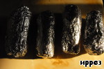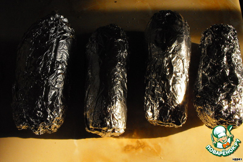 Выложить каждый баклажан на кусок фольги (рассчитывайте так, что потом нужно обернуть фольгой баклажан).