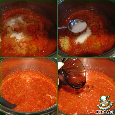 На мясорубке перекрутить помидоры, чеснок и все перцы.