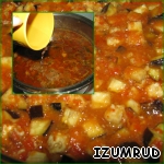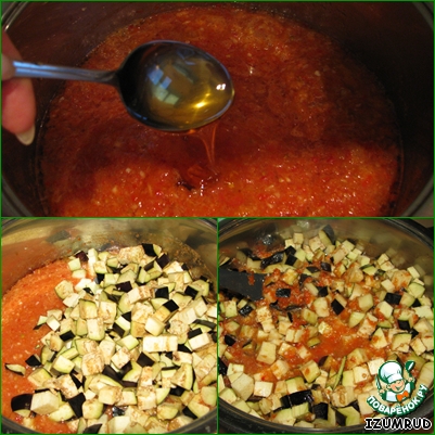 Нарезать не крупно, кубиком, баклажаны и сразу всыпать их в кастрюлю и добавить мёд.