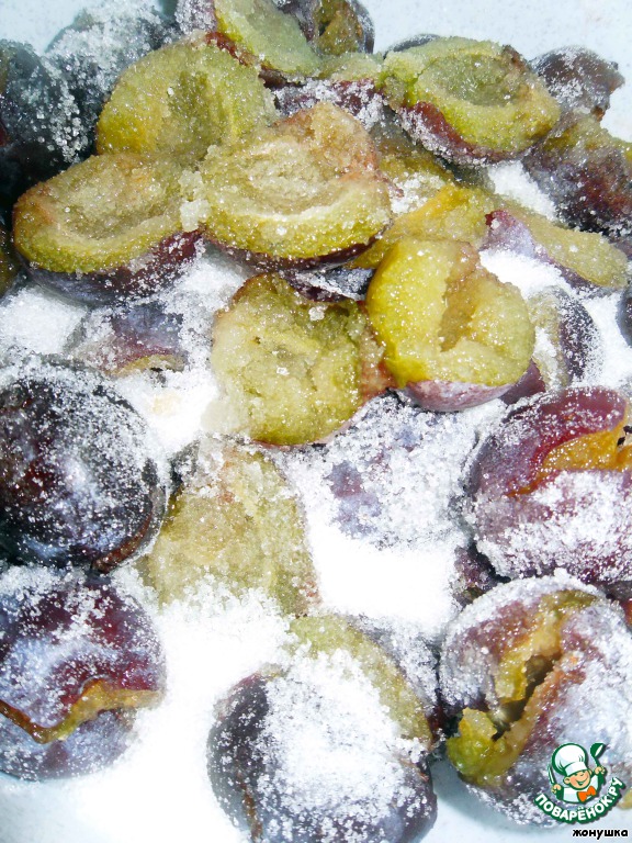 Сливу разделяем, косточку удаляем и засыпаем сливу половиной сахара, на 7 часов.