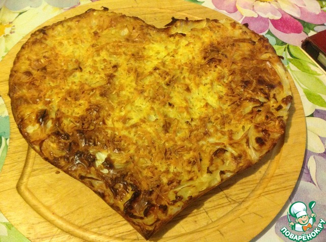 2. Капусту нашинковать, помять руками, чтобы она стала мягче, добавить сыр, соединить с тестом, перемешать.