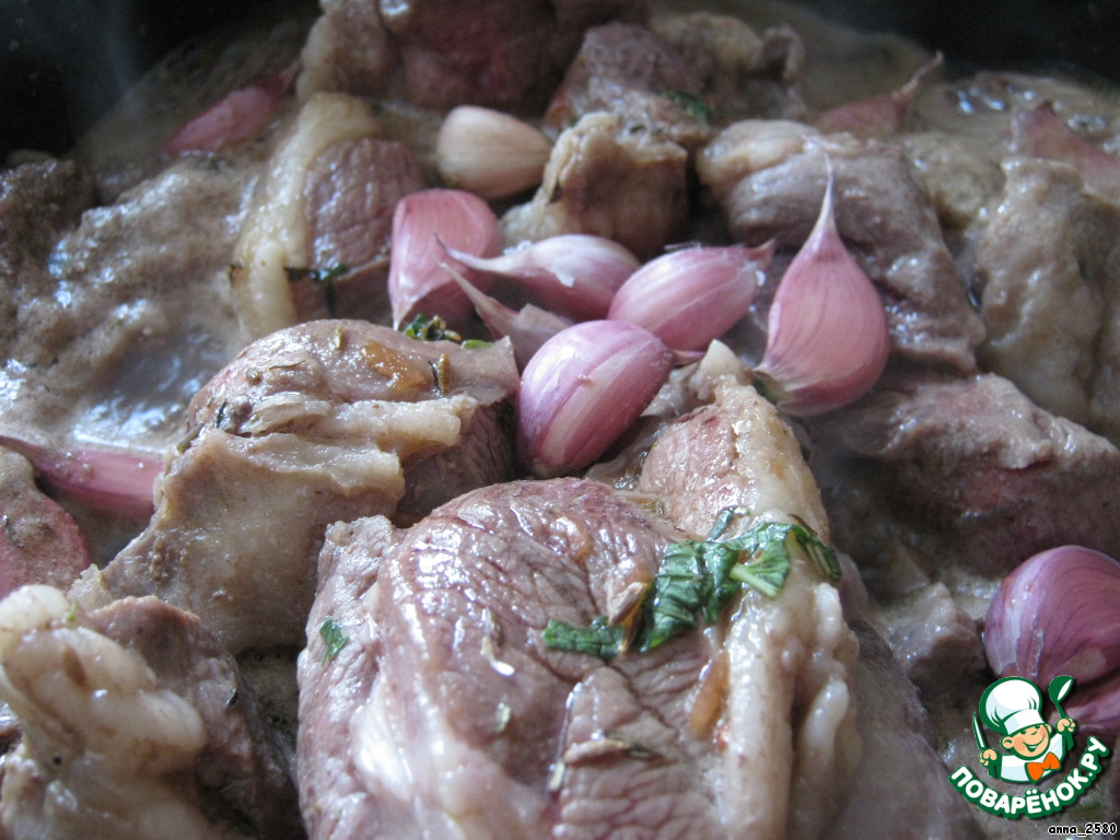 И чеснок. Я его просто разделила на дольки и сняла верхнюю шелуху. Но совсем из "панциря" не доставала. После совместного тушения с мясом он будет оооочень вкусный!