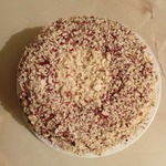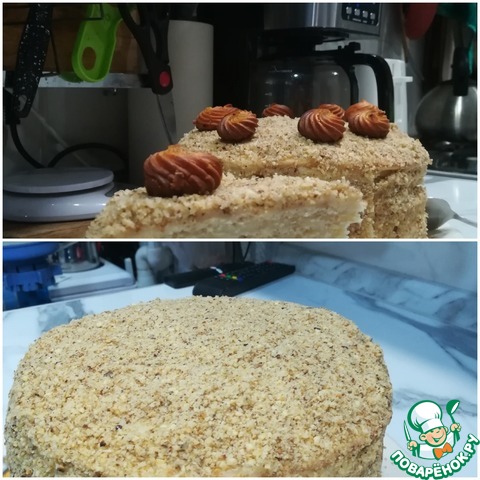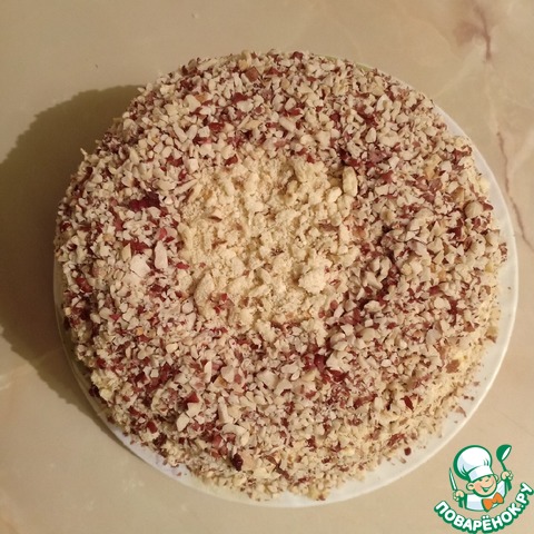 Обрезки коржей руками перетираем в крошку и добавляем измельчённые грецкие орехи. Хорошо обсыпаем торт.