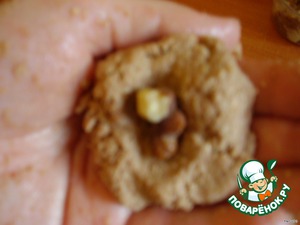Разделите тесто на кусочки, скатайте шарики, а внутрь вставьте орех. Обмакните в кокосе.