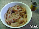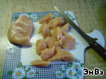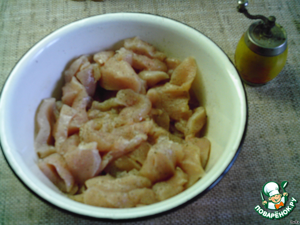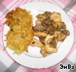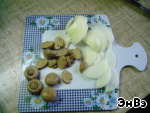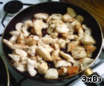 Пока филе жарится, порезать лук полукольцами, выложить на сковороду большего размера и немного потушить в растительном масле, а тем временем порезать грибы на 3-4 кусочка каждый. К протушенному луку добавить грибы и жарить тоже до золотистого цвета.