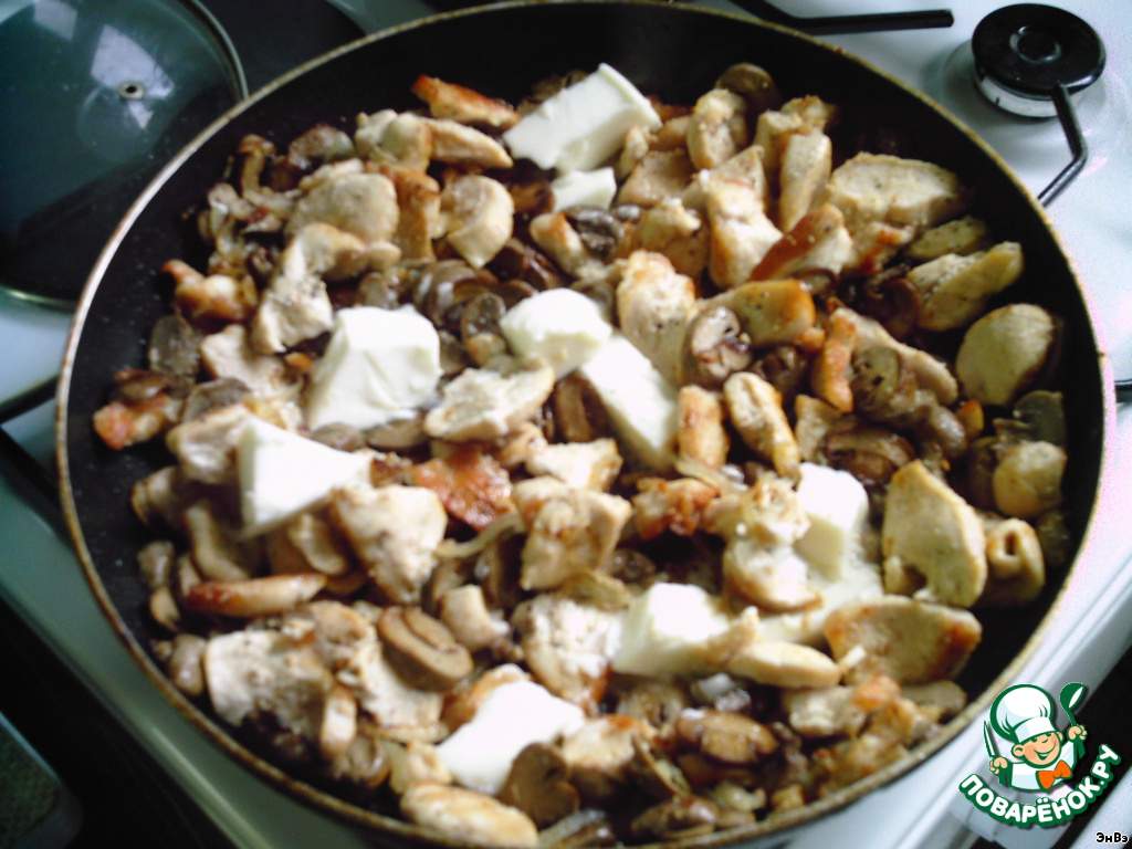 Готовые филе и грибы соединить в большей сковороде, посолить, добавить сушеного орегано (исключительно по желанию) и разрезанный на кусочки плавленный сырок. Помешивать, пока сырок не расплавится, чтобы равномерно его распределить.