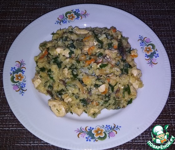 Пока готовится каша, мелко нарезать куриное филе и обжарить