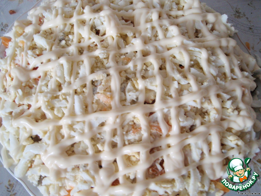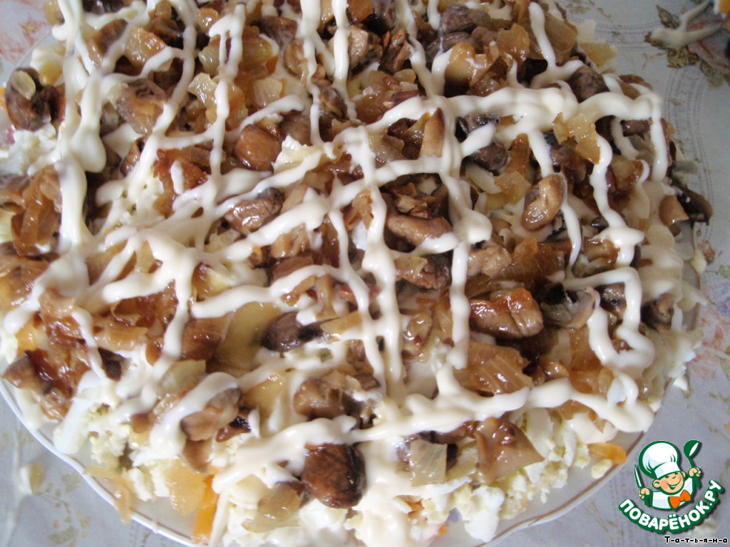 Шампиньоны и лук мелко нарезать, обжарить в масле, соль и перец добавить по вкусу. Уложить следующим слоем.