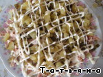 Куриную грудку нарезать кубиками выложить на дно тарелки. Салат выкладываем слоями, промазывая майонезом.