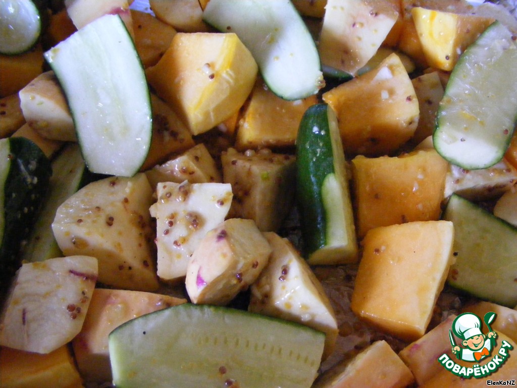 Курица в духовке, займемся овощным гарниром - чистим барат и тыкву, режем крупными кусками, цуккини на 4 части. Овощи выкладыаем в отдельный противень, заливаем заправкой, хорошо перемешиваем.