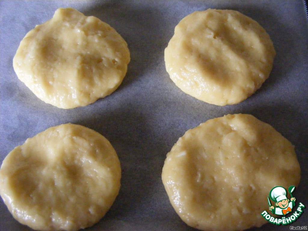 Из теста скатываем шарики, величиной с грецкий орех, и формируем маленькие лепешечки, выкладываем на пекарскую бумагу.