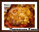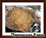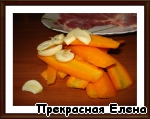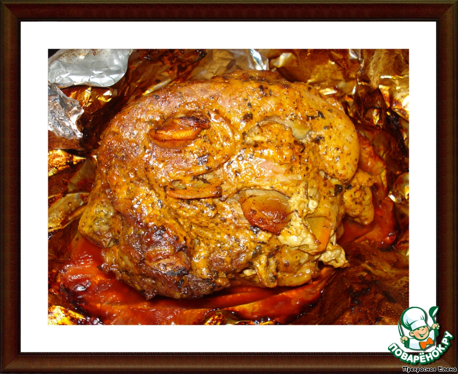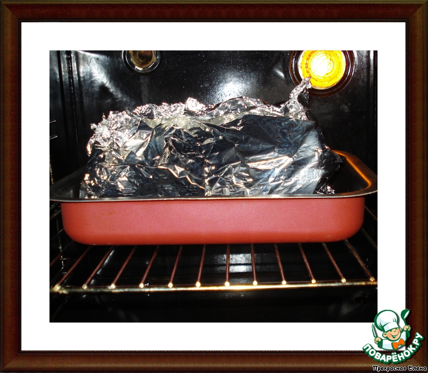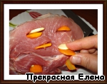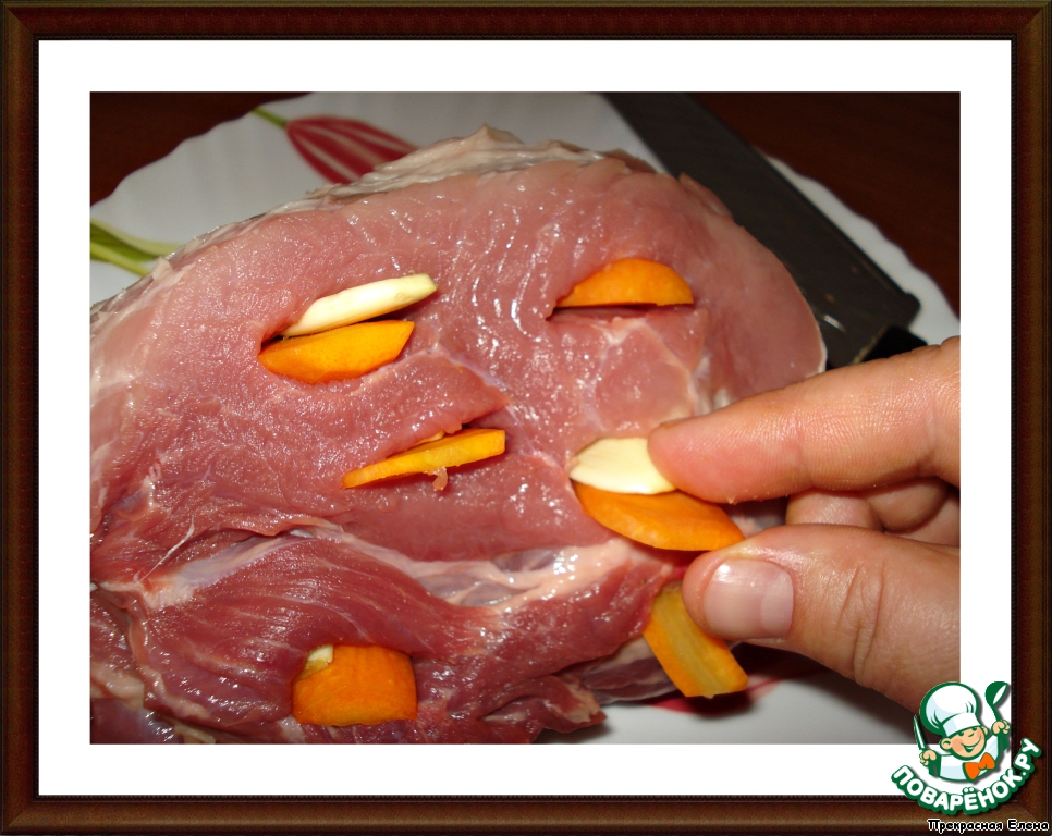 Сделав в окороке прорези вдоль волокон, вставляем морковь и чеснок. |