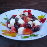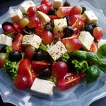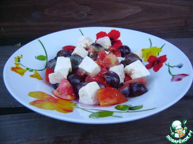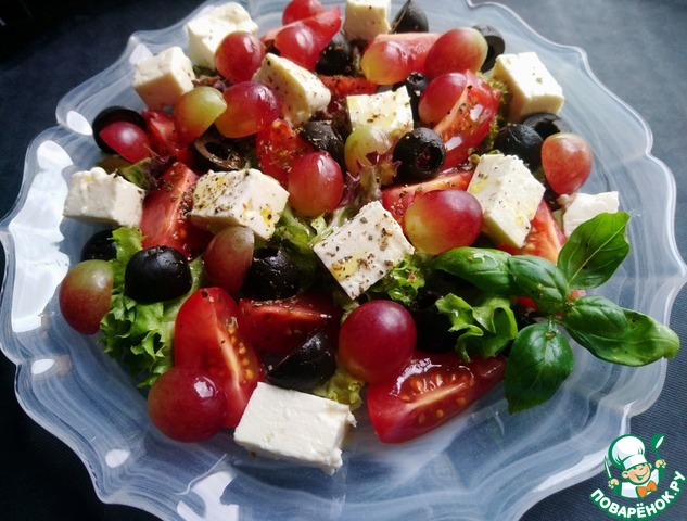 Все до безобразия просто. Помидор - кубиками, брынзу тоже (Фетакса режется великолепно, не крошится, прелесть!), виноград - половинками (косточки вынуть!). Заправляем ароматным оливковым маслом (делаю сама, настаиваю на травах, в данном случае взяла тимьян, стебли петрушки, чеснок и жгучий перец), но масло получилось не острое, поэтому салат сверху еще сбрызнула белым молотым перцем.