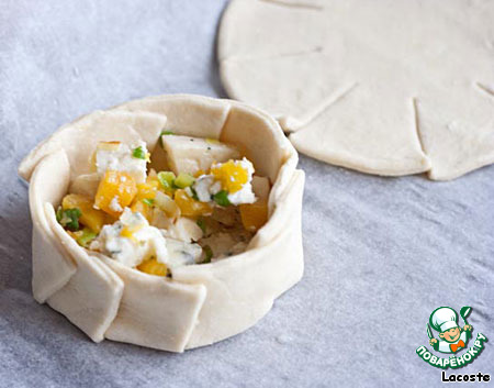 Выложить полную столовую ложку начинки на заготовку из теста. Смазать "лепестки" водой. Поднимаем "лепесток" за "лепестком" и укладываем их (внахлест) таким образом, чтобы в итоге получилась розетка из теста.