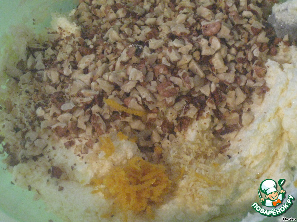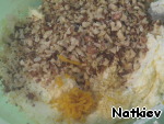 Добавляем орехи, цедру, хорошо перемешиваем. Если нет цедры, замените ее ванилином.