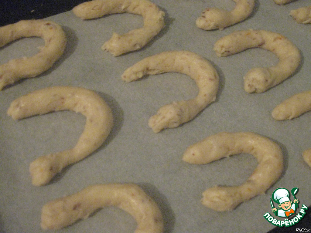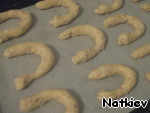 Формируем печенье, я обычно делаю в виде подковы, выкладываем на противень, застеленный бумагой для выпечки. Выпекать до золотистого цвета.