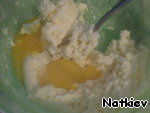 Всыпаем муку и разрыхлитель и замешиваем тесто, оно должно липнуть к рукам.
