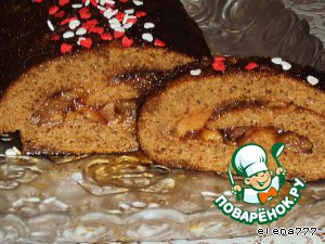 Пакетик сухого апельсинового желе (50 г) я залила 150 г воды и хорошо перемешала. Добавила туда яблоки и поставила в холодильник для того, чтобы желе немного схватилось. Затем промазала пласт, завернула рулет и положила его в холодильник для застывания. И получился у меня шоколадный рулет с желейными яблоками.