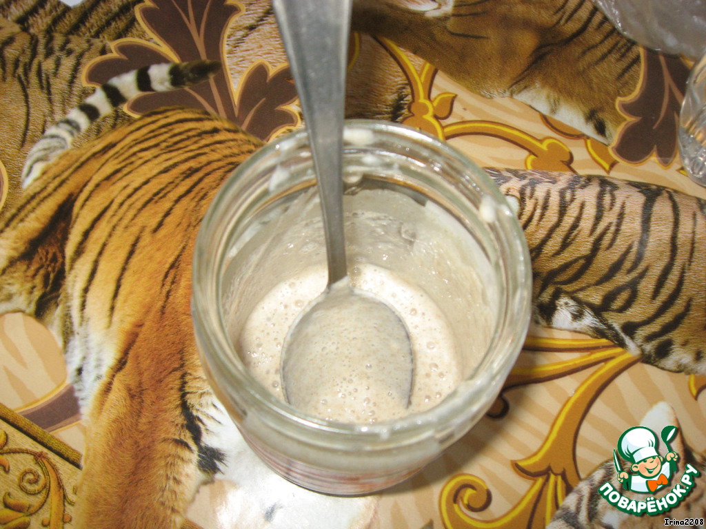 Для закваски 0,5 стак. ржаной муки смешать с 0,5 ст. л. сахара и 1 ч. л. дрожжей. Добавить воды, чтоб тесто было жидкое, как на оладьи. Оставить на 12 часов и потом поставить в холодильник. Я на ночь ставила на кухне, утром сразу пекла. Нам понадобится 2 ст. л. закваски.