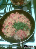 Теперь добавляем нарезанный соломкой болгарский перец и еще через минутку - мелко порезанную зелень и чайную ложку горчицы. Сразу же почувствуете пикантный аромат.